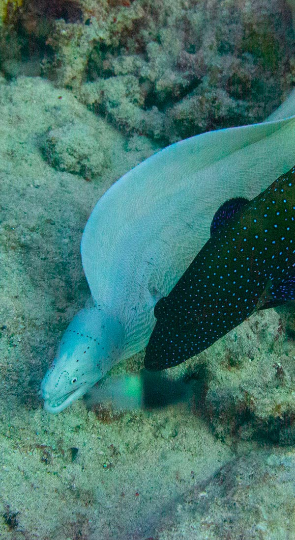 Contrairement à ce que beaucoup croient, les murènes ne sont pas méchantes, ni électriques :). Cependant, leurs dents sont dirigées vers l'intérieur, ce qui rend l'échappatoire plus difficile !